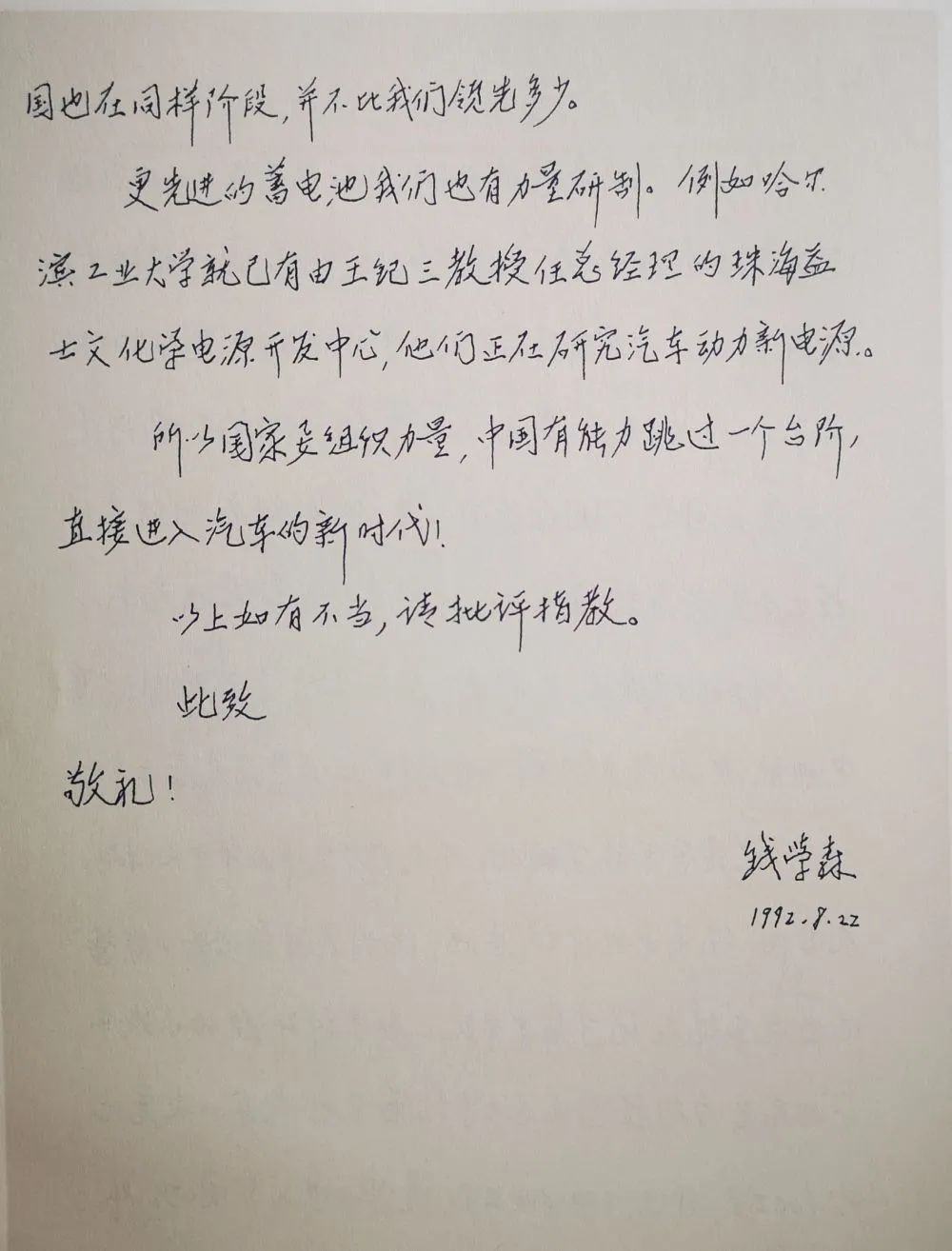 1992年8月22日,钱学森写信,探讨汽车工业。图片来源:钱学森图书馆
