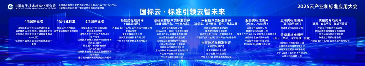 为推动云计算国家标准在产业中落地生根,电子标准院开展“国标云”研制及贯标工作,取得了丰硕成果。11项关键技术标准相继制定,覆盖超融合、云迁移、智算服务等前沿方向;40余项权威测评全面开展,涵盖公有云弹性性能、算力服务成熟度、云解决方案等核心能力;天翼云、阿里云、华为云等30余家领军单位积极参与,共同筑牢可靠、高效、智能的云底座。