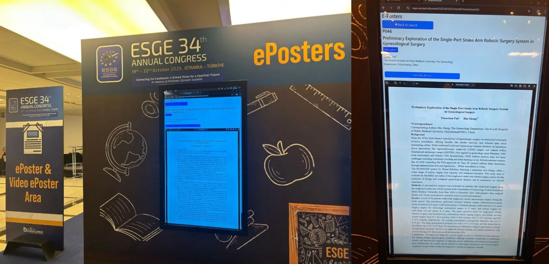 2025年10月,历史名城伊斯坦布尔迎来了一场学术盛宴——第34届欧洲妇科内镜学会年会(ESGE 2025)。作为全球妇科内镜领域最具影响力的学术会议之一,本届年会汇聚了该领域的顶尖专家与学者,共同探讨与展示微创外科技术的最新进展与未来方向。在这场高水平的国际学术盛会上,来自中国河北医科大学第四医院张辉教授团队的一项创新研究成果——《单孔蛇形臂机器人手术系统在妇科手术中的初步探索》,经由大会组委会严格遴选,获推荐进入壁报交流环节,标志着中国在妇科高端微创器械与手术技术融合领域的探索成果,在这一顶级国际平台上获得了系统性的展示与关注。