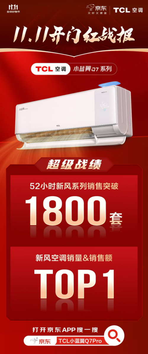今年双11的开门红战役,为新消费趋势写下了鲜明注脚。TCL空调与战略合作伙伴京东共同宣布,旗舰产品TCL小蓝翼Q7系列新风空调,在京东平台开门红关键52小时内销量突破1800套,强势登顶京东新风赛道销售额榜首。