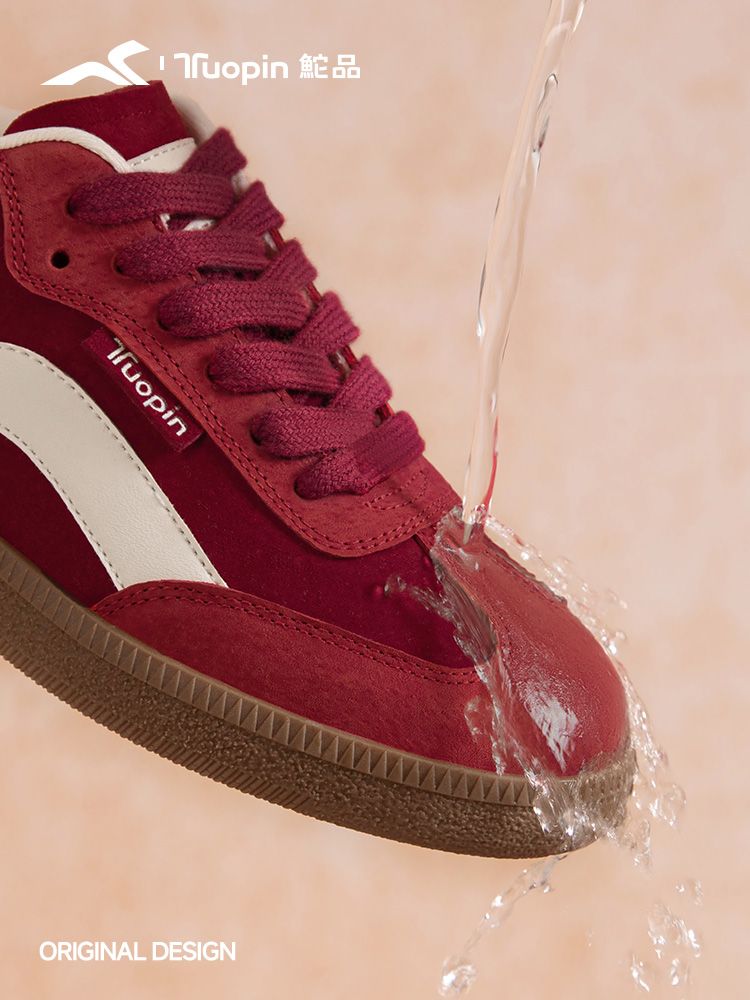 国货鮀品品牌推出的这款升级款复古红德训鞋,以不同深浅色调的真皮拼接设计,鞋子的质感和耐用性也能得到显著提升。鞋子侧身的品牌LOGO则采用白色,层次分明,视觉上也更加提升美感。