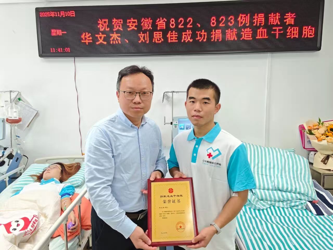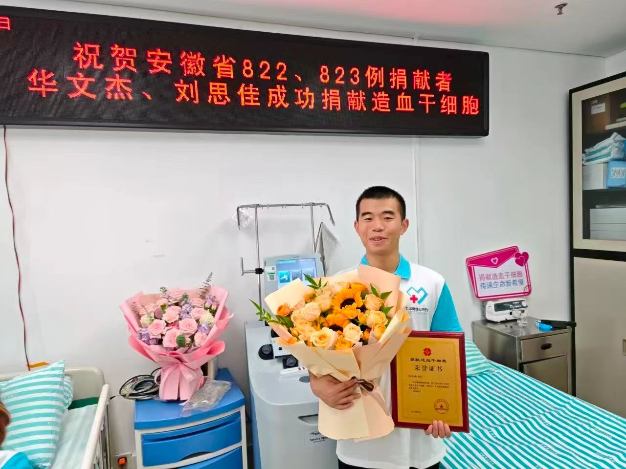 蚌埠发布客户端讯(记者 陈瑶 通讯员 吴启迪 文/图)这是一场历时六年的生命之约,这是一次跨越山海的生死接力。11月10日,在安徽省立医院的采集室里,216毫升造血干细胞混悬液如同珍贵的生命火种,从“00后”现役军人华文杰的体内缓缓采集,将为一位素不相识的血液病患者重燃生命之光。华文杰成为了安徽省第822例、蚌埠市第30例造血干细胞捐献者。