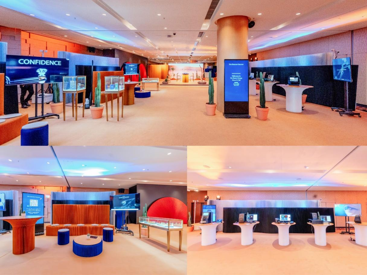 为深化消费者体验,戴比尔斯集团以沙漠地质奇观为灵感,打造了沉浸式Show&Tell空间。现场通过沙丘造型展陈、光影动态投影与可触摸的沙漠矿物标本,将天然钻石的诞生环境与产品特性深度融合。参观者仿佛置身于沙漠腹地,在探索中感知天然钻石从岩层到珠宝的艺术蜕变。这种叙事型体验成功将产品价值转化为情感共鸣,吸引了大量年轻消费者与行业买家的关注。