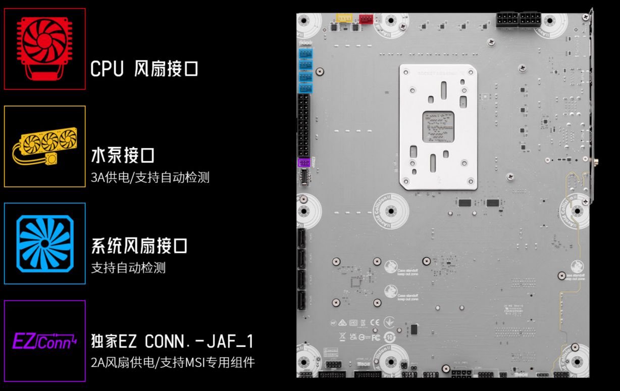 预装I/O面板、EZ Connector快速接线设计,搭配MSI Center统一控制RGB灯效与系统设置。CLICK BIOS X图形化界面让超频与调试更直观。