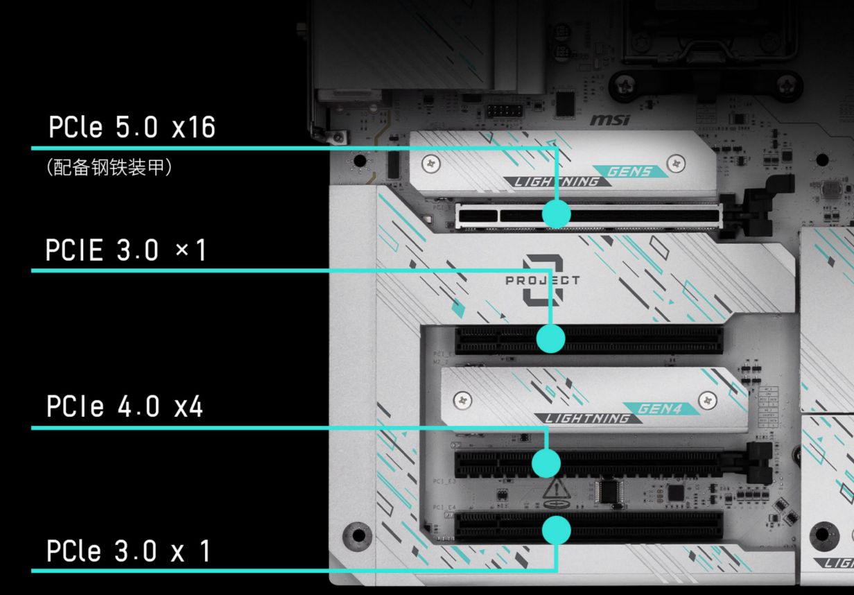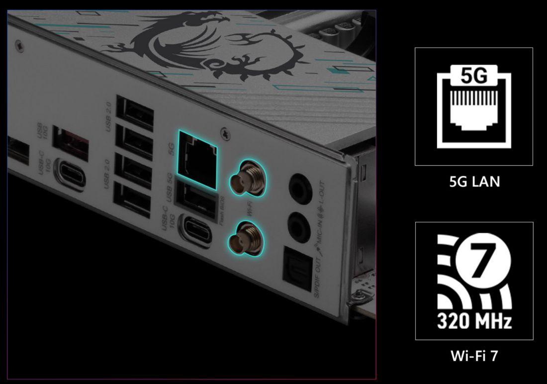 配备PCIe 5.0 x16显卡插槽、3组M.2接口(含Gen5 x4 128Gbps),并覆盖冰霜铠甲散热。网络方面搭载Wi-Fi 7与5G有线网卡,配合MSI AI网络管理器智能优化游戏流量。