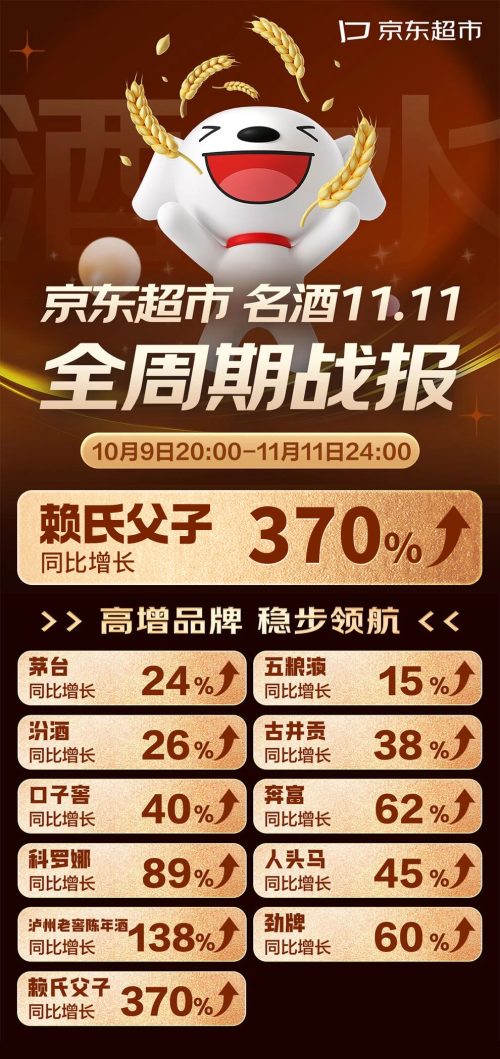 简讯:京东超市双11酒类销售排行,赖氏父子同比增长370%,增速第一!