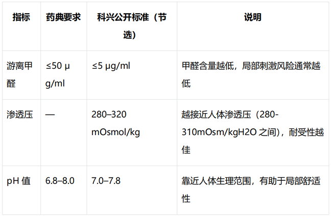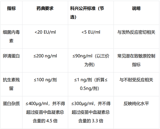 根据科兴公开资料,其多款季节性流感病毒裂解疫苗在生产过程中对与局部耐受性、过敏反应可能相关的关键指标设有明确控制标准,包括游离甲醛、细菌内毒素、卵清蛋白含量、抗生素残留、渗透压、pH 值等。下表摘录了部分公开指标,便于大家了解相关参数。