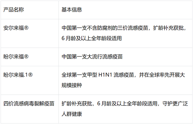 科兴流感类疫苗产品线丰富多元,不仅涵盖季节性流感常规防控需求,更具备流感大流行应急响应能力,其中,科兴的安尔来福®和四价流感病毒裂解疫苗自上市以来在全球安全使用超1亿剂,并持续中标国内公费项目。科兴完备的流感疫苗产品线,使得从 6 月龄婴幼儿到老年人全年龄段人群均可找到适配选择,为流感防控提供全方位、多层次的保障。