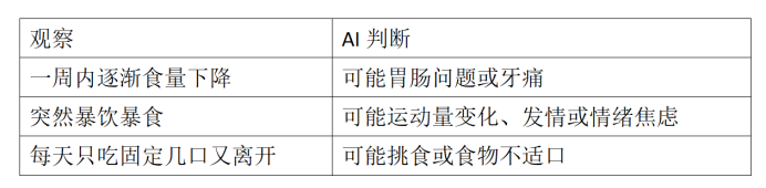 通过短期+长期对比,AI能够生成宠物的“喂食健康曲线”。例如: