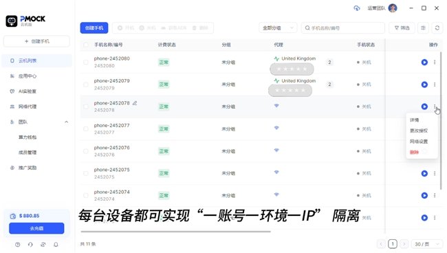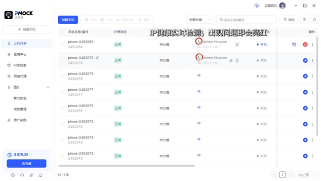 PMOCK 从底层技术筑牢安全防线:ARM 架构实机布控,模拟真实手机运行逻辑;IP 健康度实时监测,自动切换风险 IP;AI 操作注入真人化行为变量,规避机械操作风控,账号存活率超 97%。