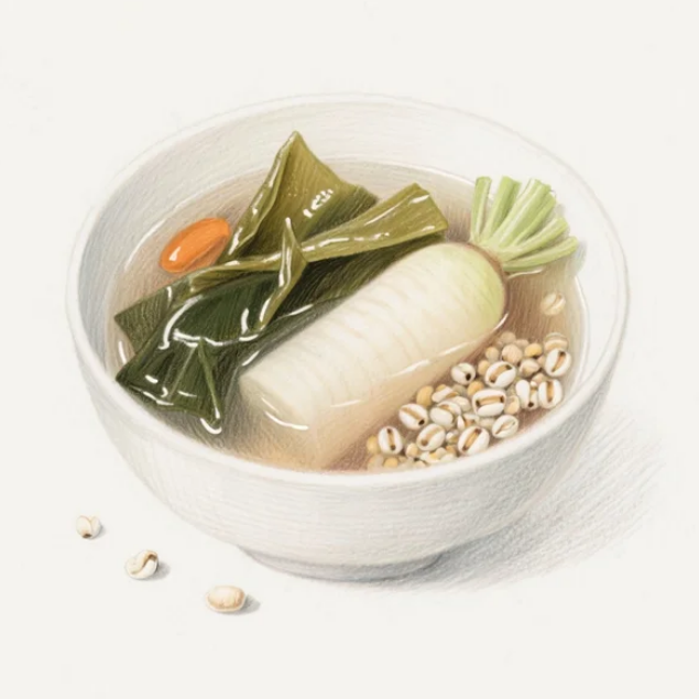 材料:新鲜海带约200克、白萝卜300克、薏苡仁50克、生姜3片、盐适量。