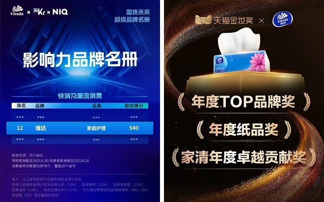 据Worldpanel《2025品牌足迹报告》显示,维达消费者触及数达4.87亿人次。与此同时,品牌还荣登尼尔森IQ×36氪“国货未来超级品牌”榜单,成为快消领域首个入选的家庭护理品牌。在今年8月的天猫金妆奖评选中,维达斩获“年度TOP品牌奖”“年度纸品奖”和“家清年度卓越贡献奖”等三项重量级荣誉,印证了其体育营销战略在商业路径的有效性。