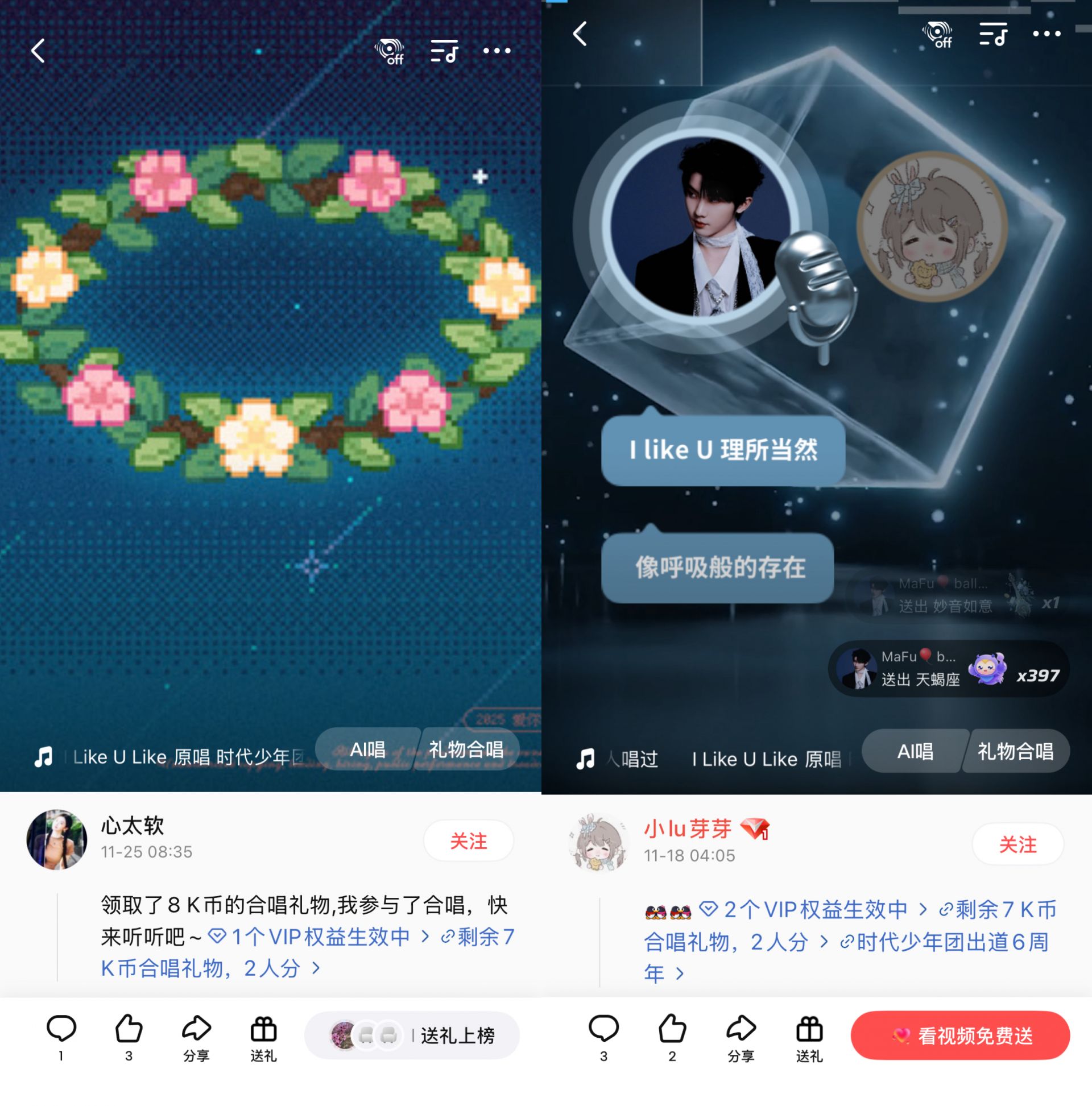 作为华语乐坛炙手可热的青春偶像团体,时代少年团于2019年十一月出道,凭借其极具感染力的音乐风格推出了多首传唱度爆棚的作品。早期有出道双单曲《全校通报》《无尽的冒险》;后续陆续推出《渐暖》《百忧戒》《有你的季节》《背对地球奔跑》《青春不枉》等;2025年又发布了《登顶》《I Like U Like》《冠军》《这一程》等单曲,适配不同阶段的音乐表达与主题传递,也成为了许多歌迷翻唱的首选。例如,K歌网友“心太软”翻唱了《这一程》,在“VIP音质”的加持下声音更显干净纯粹、细腻动人,将原曲中少年们回望成长、感恩同行的温情与坚定诠释得十分到位;K歌网友“小lu芽芽”则使用“VIP音效”、“VIP音质”双重功能翻唱《I Like U Like》,其声线更显清亮灵动,不仅放大了歌曲的甜酷质感,更让每一段节奏都清晰立体、感染力拉满。