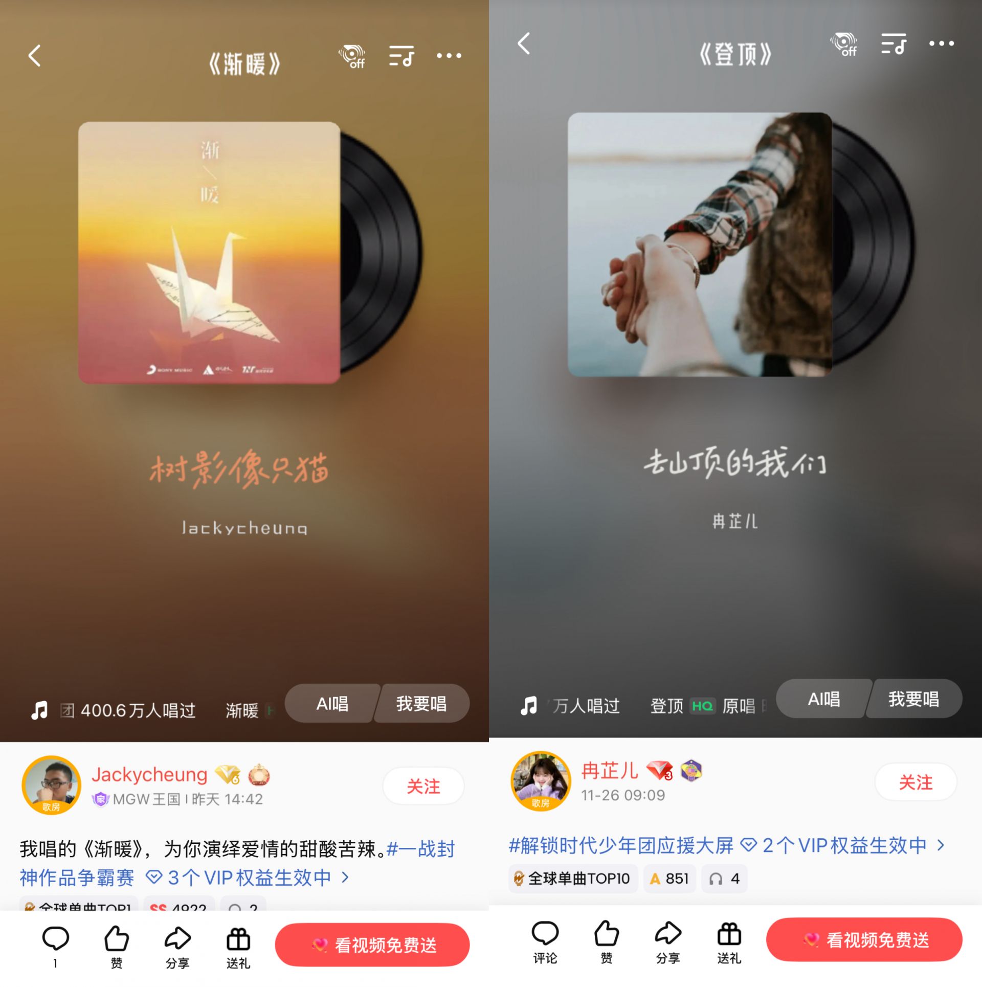 演唱会之余,时代少年团其他的音乐作品也在全民 K 歌备受青睐,翻唱热度居高不下。例如,K歌网友“Jackycheung”翻唱了《渐暖》,在“VIP音效”、“VIP伴奏”、“VIP音质”三重功能赋能下将《渐暖》里少年感满满的心动与温柔诠释得恰到好处,用歌声展现出六个少年的青春韵味;K歌网友“冉芷儿”则使用“VIP伴奏”、“VIP音质”双重功能翻唱了《登顶》,高保真的伴奏与音质让歌声更具力量感。将歌曲中少年奔赴理想的热血与坚定诠释得淋漓尽致。