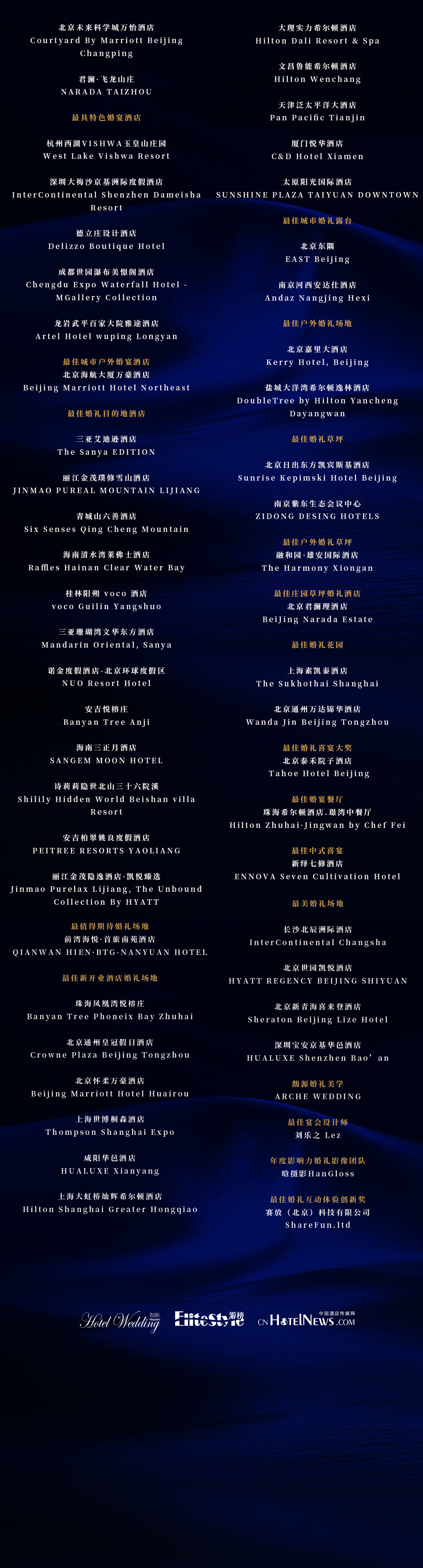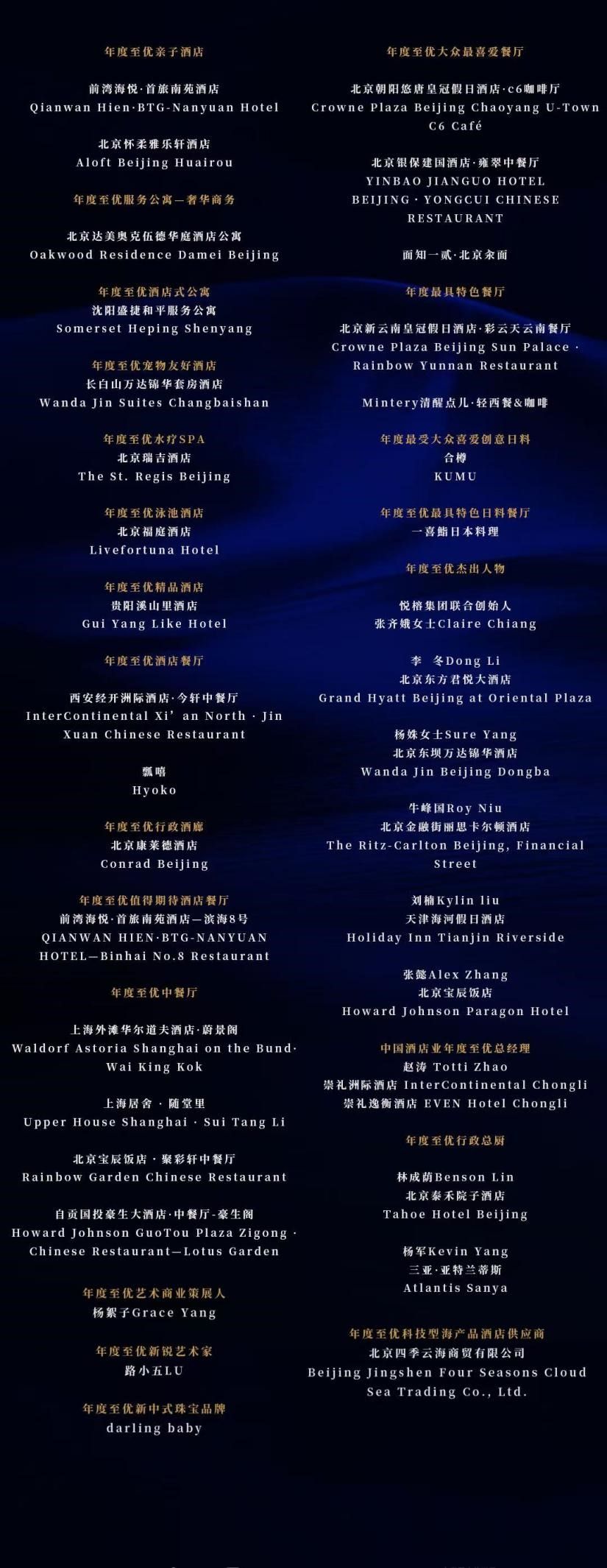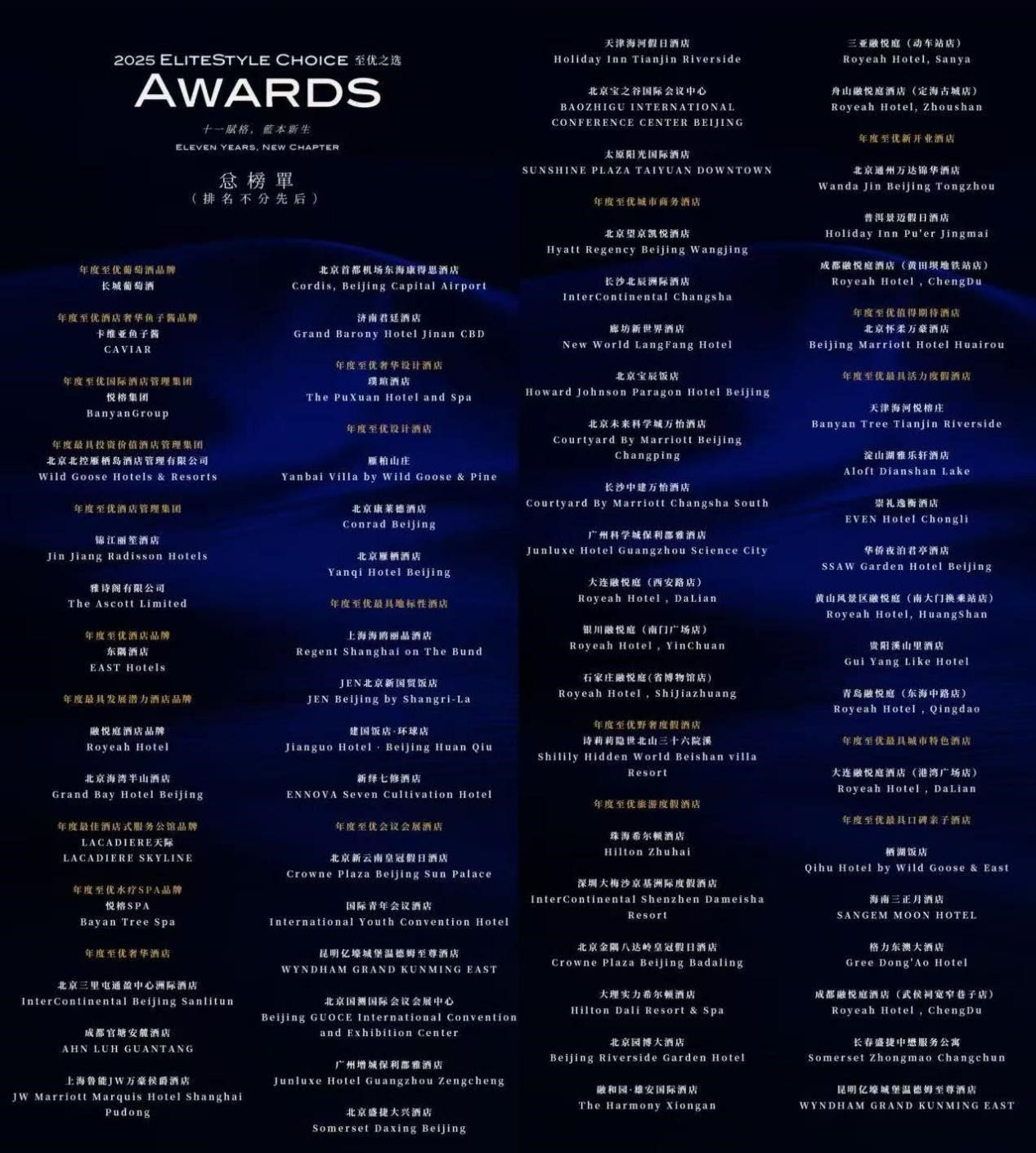 从第十届的“恒聚·拾终”到第十一届的“赋格·新生”,我们亲历并推动着行业的演进。站在新十年的开端,我们不仅致敬卓越,更致力于为行业注入持续成长的生命力。所有获奖酒店与个人,皆以智慧与匠心诠释“新生”的蓝本,他们既是行业的中流砥柱,更是照亮前路的灯塔。