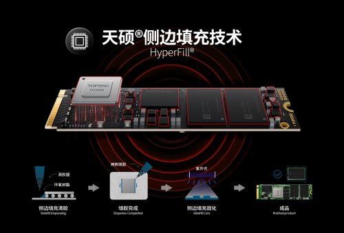 HyperFill® 淘汰了传统脆性胶材,通过在 BGA 封装的芯片的侧面,涂抹环氧树脂来增强PCB板和焊点之间的连接,抵抗振动、冲击和热应力等问题,延长SSD的使用寿命。在工艺层面,天硕产线采用高精度填胶设备。填充完成后,天硕会通过紫外光对树脂进行可控热固化,确保其快速均匀反应并优化粘接强度与弹性。最后实施多重质检,严格验证防护层可靠性后才会进入后续工序。