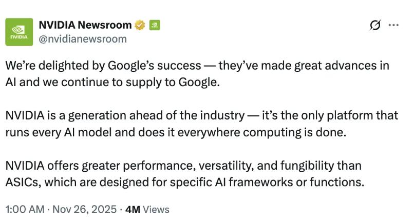 另一边,当地时间11月26日,英伟达(NVDA.US)通过官方渠道发声,强调其技术平台在人工智能领域的领先地位。英伟达在声明中虽对谷歌表示祝贺,但明确指出,与谷歌 TPU 这类专用芯片相比,其产品在性能、通用性和可替代性上更具优势。