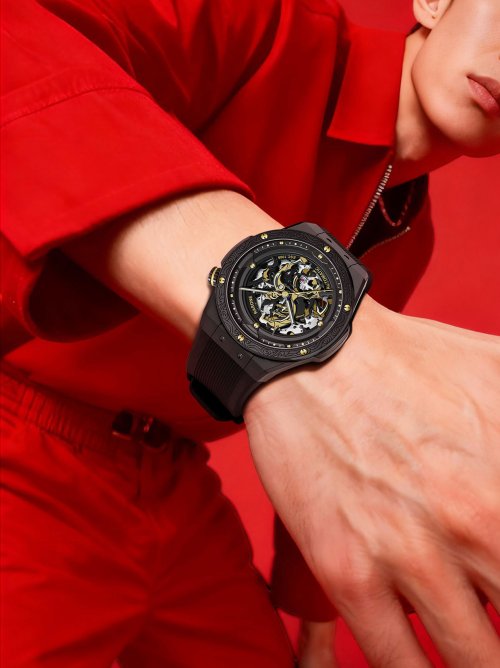 除了核心的金马造型,这款腕表在工艺细节上同样令人赞叹,1200度激光凝聚切割技术 ,结合超亮电铸UP,精心匠造全表零件,让金马在复杂立体的机械结构中依然轮廓分明,栩栩如生;而源自于书法大家的倒置“成”字,历经多道精细打磨工艺,清晰展示出其自带的东方书法韵味与潮酷金马相得益彰。