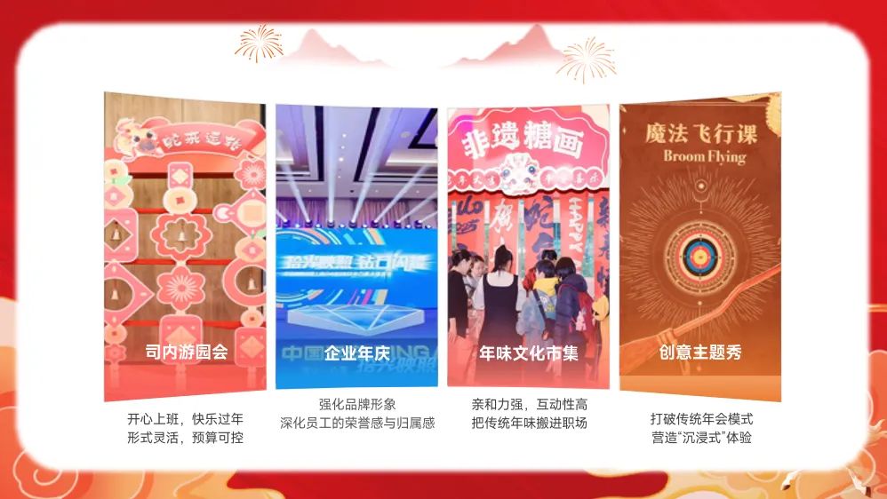 关爱通同样精于筹办高质量新年全案活动,打造令人难忘的员工体验。从营造欢乐氛围的司内游园会,到彰显企业文化的企业年庆;从年味十足的年味文化市集,到新颖潮流的创意主题秀,关爱通均能提供从创意策划到落地执行的一站式服务,全方位营造浓厚的新年氛围,让企业关怀变得可感、可触、可分享。