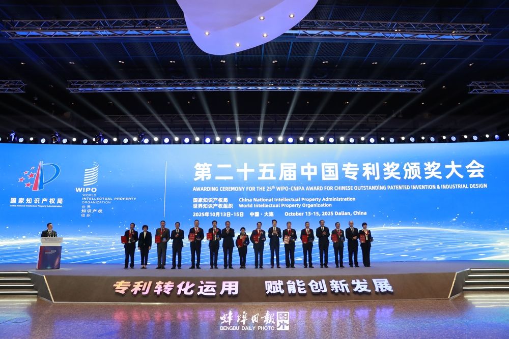 蚌埠发布客户端讯(融媒体记者 顾楷)10月13日,第二十五届中国专利奖颁奖仪式举行。我市中建材玻璃新材料研究院集团有限公司和蚌埠中光电科技有限公司联合参评的发明专利“一种高世代TFT-LCD玻璃基板生产线”以不到1%的获奖率脱颖而出,作为30项获奖成果之一,被国家知识产权局和世界知识产权组织授予中国专利金奖,这也是我市时隔26年再次摘得中国专利金奖。中国工程院院士,中国建材集团首席科学家、科技委主任,中研院院长彭寿作为中国专利金奖获奖代表在颁奖仪式上发言。
