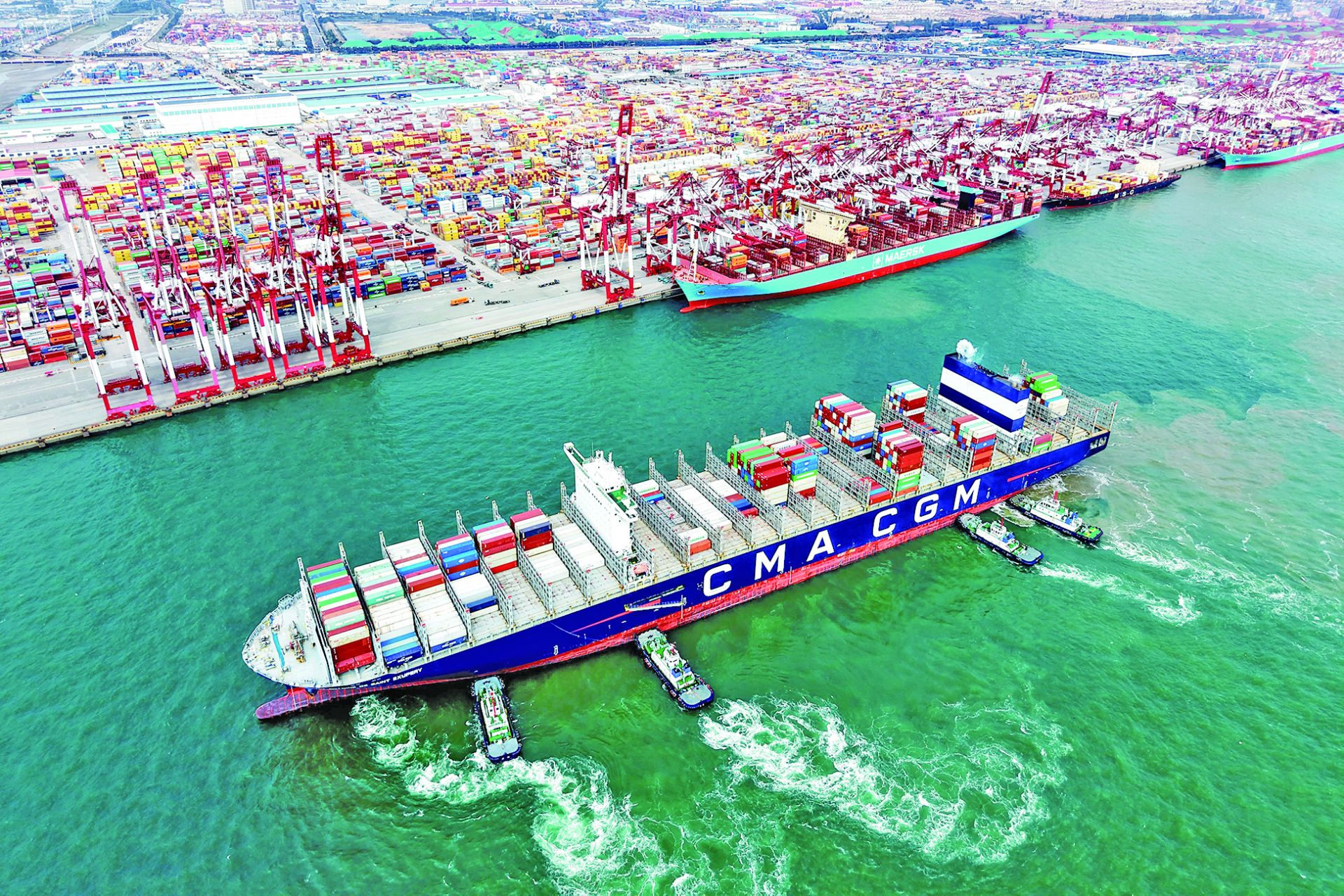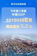 10月20日,在山东港口青岛港,一艘货轮在拖船辅助下停靠集装箱码头(无人机照片)。 10月20日,国家统计局发布数据显示,初步核算,前三季度中国国内生产总值(GDP)1015036亿元,按不变价格计算,同比增长5.2%。 新华社发(俞方平 摄) 0
