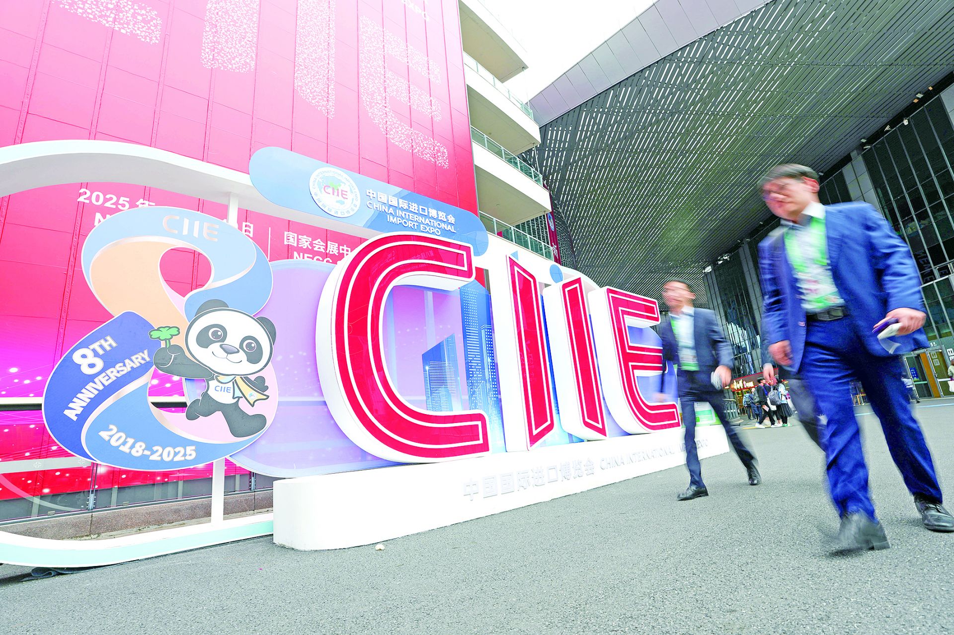 11月5日,人们从第八届进博会主题装饰前走过。 11月5日,第八届中国国际进口博览会在国家会展中心(上海)开幕。本届进博会有155个国家、地区和国际组织参与,4108家境外企业参展,展览面积超过43万平方米,展览面积和企业总数均创历史新高。(新华社记者 任鹏飞 摄) 0