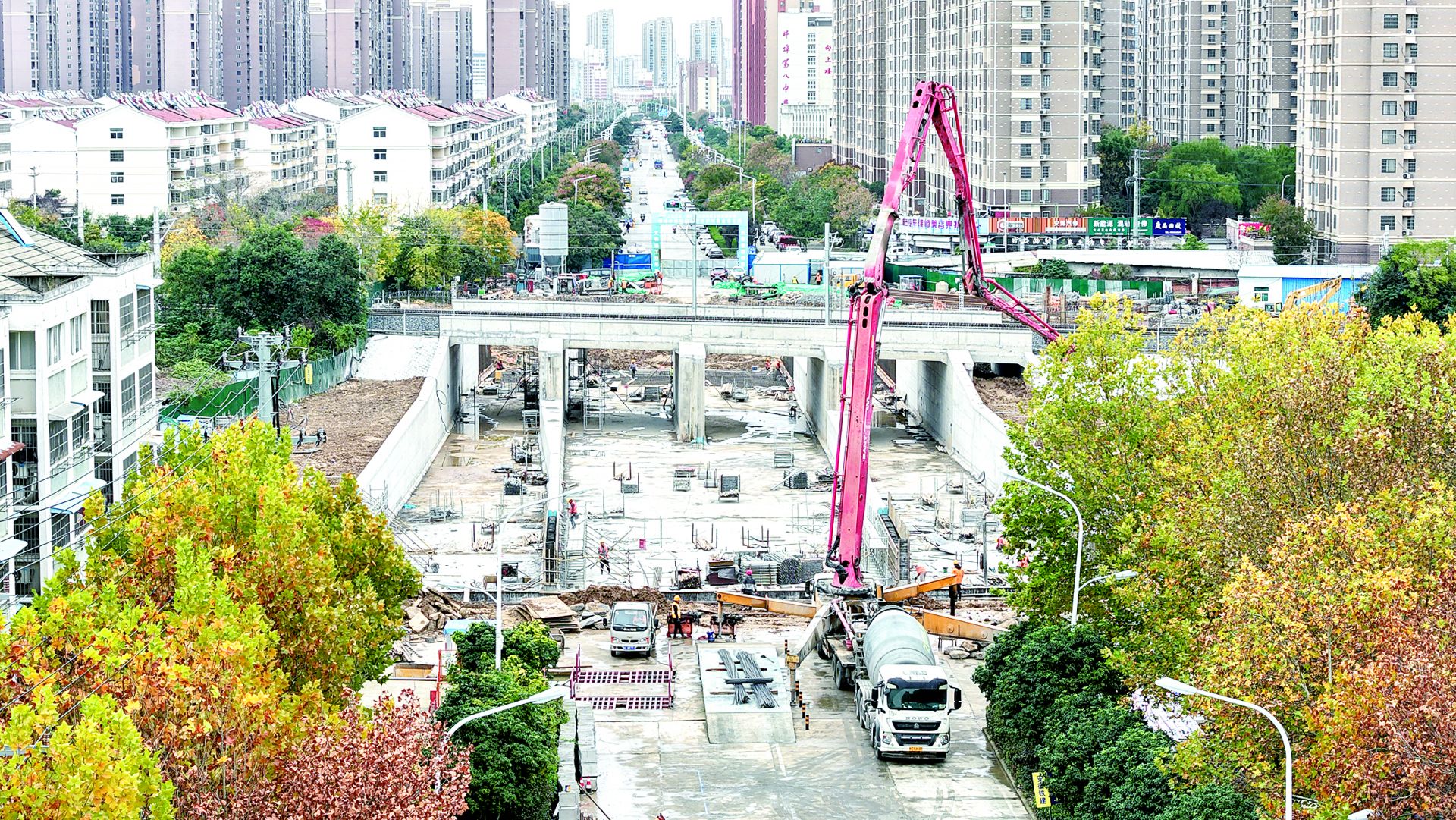 11月17日,双墩路下穿京沪铁路立交工程现场,施工人员正在加紧施工,整个建设规模已经显现。位于淮上区、全长305米,新建双墩路采用5孔分离式框架结构下穿京沪铁路。待放行后,将打通淮上区铁路两侧交通,进一步缓解淮上大道交通拥堵,对完善淮上区路网结构有较大提升。据介绍,当前涉铁段的5孔主体箱涵已全部顶进就位,正在进行引道U型槽作业,下一步将进入道路铺装阶段,今年年底满足(主车道)通车条件。 记者 刘晨 摄