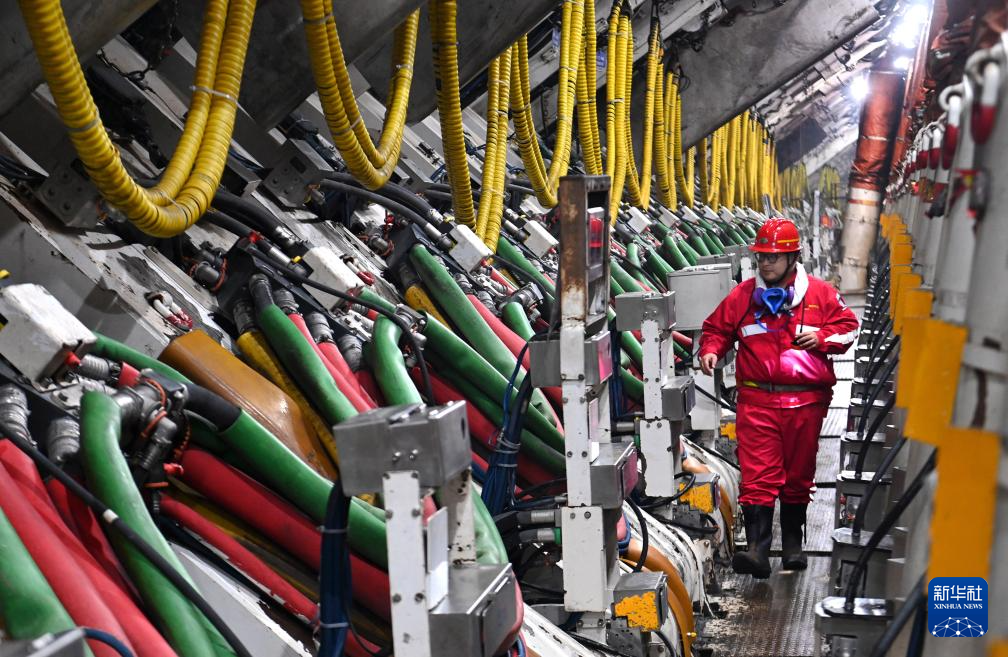 工作人员在陕西陕煤曹家滩矿业有限公司全自动液压支架支撑的采煤工作面巡检(2024年2月29日摄)。新华社记者 邹竞一 摄