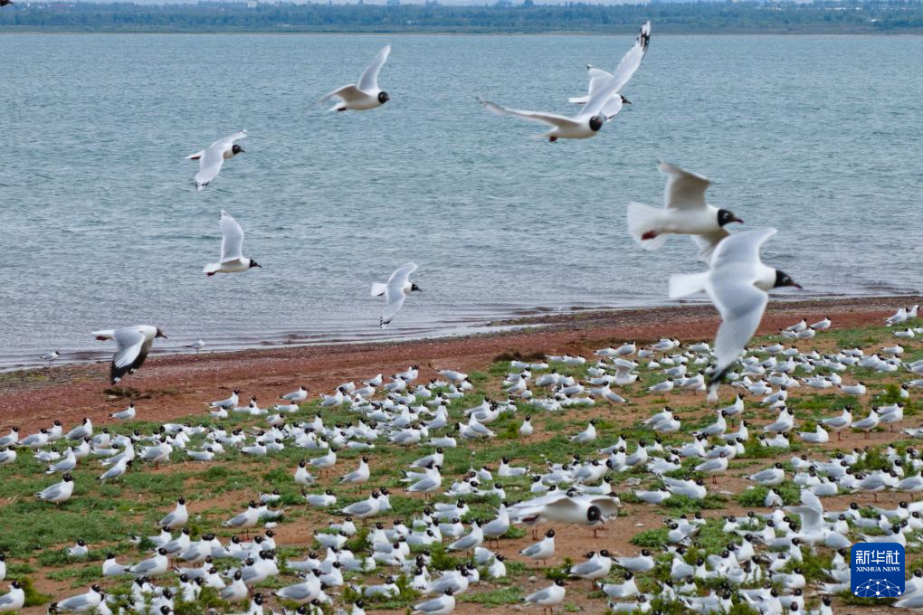 红碱淖国家级自然保护区湖心岛上的遗鸥(2024年6月4日摄,无人机照片)。新华社记者 邵瑞 摄