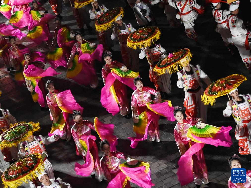 演员在榆林老街非遗大集开集仪式上表演秧歌腰鼓(2023年2月17日摄)。新华社记者 邹竞一 摄