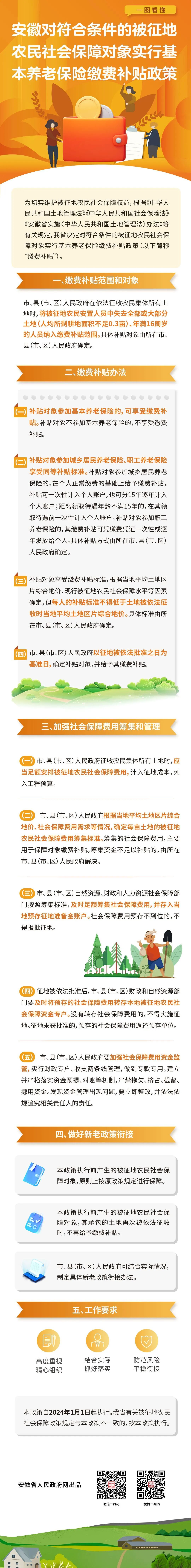 安徽对符合条件的被征地农民社会保障对象实行基本养老保险缴费补贴政策⬇⬇⬇