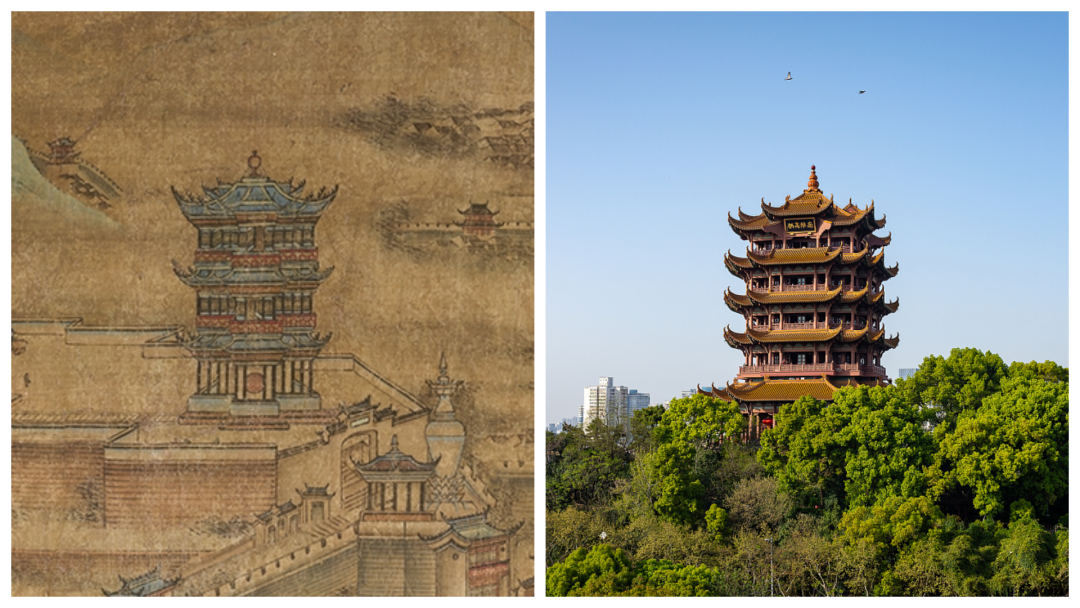 从画面的右下方向左上方则矗立着,晴川阁、胜像宝塔、黄鹤楼与洪山宝塔,并且与现存的建筑形制十分接近。