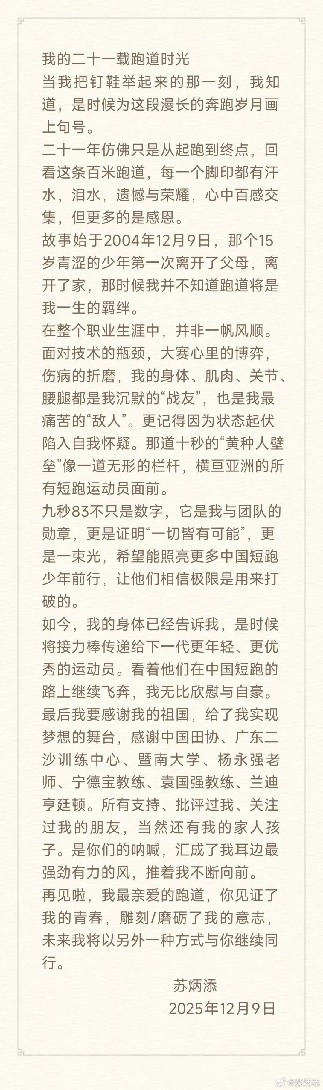 12月9日 男子100米亚洲纪录保持者 中国短跑名将苏炳添宣布退役 11月20日,苏炳添在第十五届全国运动会田径项目男子4X100米接力决赛后。新华社记者 江汉 摄 他写道:“再见啦,我最亲爱的跑道 你见证了我的青春 雕刻/磨砺了我的意志 未来我将以另外一种方式 与你继续同行” 0